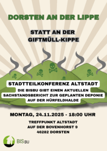 Auf der Stadtteilkonferenz Altstadt am Montag, 24.11.2025, wird unter anderem der Vorstandssprecher der BISBU, Klaus Wagner, einen aktuellen Sachstandsbericht zur geplanten Deponie auf der Hürfeldhalde geben. Thema: Dorsten an der Lippe, statt an der Giftmüll-Kippe